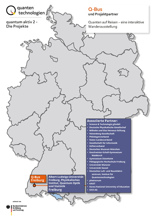 Projektziel ist eine interaktive Wanderausstellung „Quanten auf Reisen“, mit der ein Forum zur Auseinandersetzung der Gesellschaft mit Quantentechnologien der 2. Generation und ihren Grundlagen geschaffen werden soll. Die Aussstellung richtet sich an die breite Öffentlichkeit und lädt zum Erleben der Quantentechnologien ein.